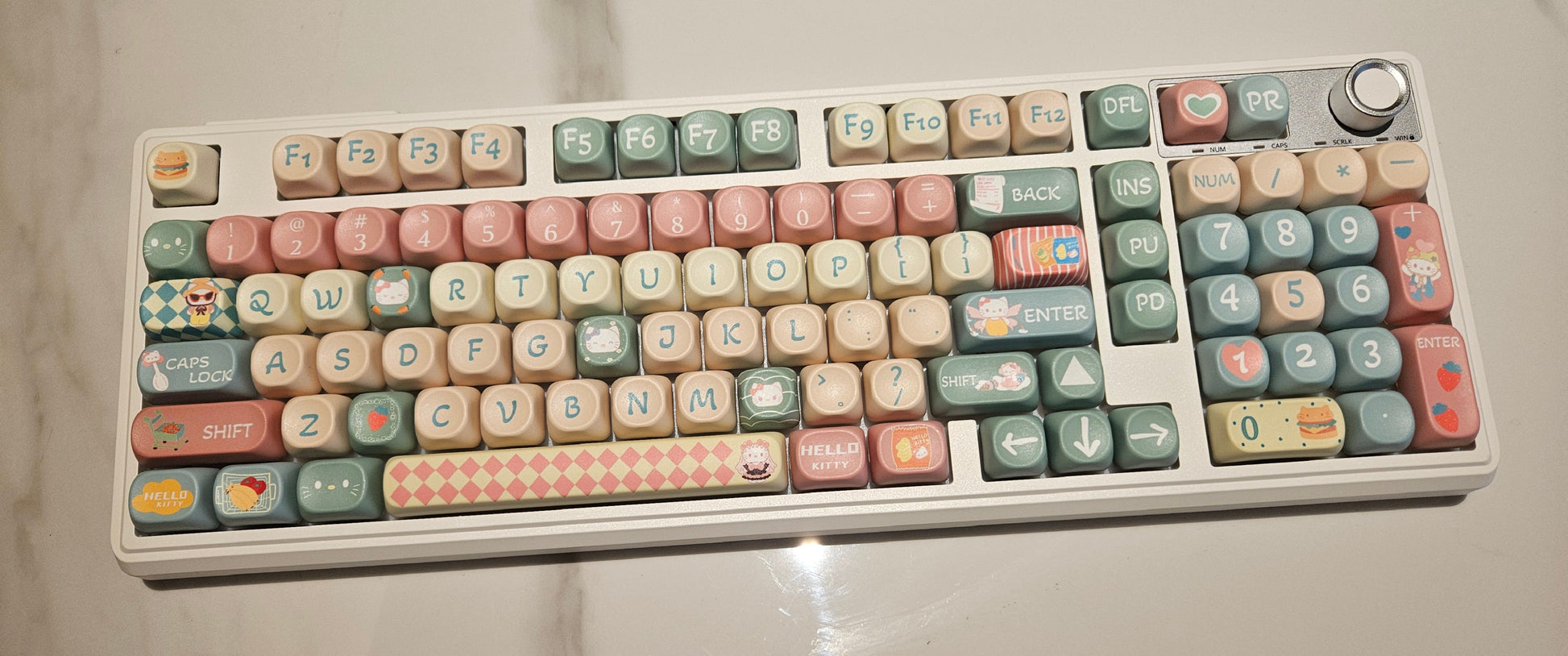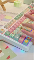 This keyboard is a whimsical feast for the eyes, featuring a warm and inviting "gourmet cafe" palette of strawberry pink, matcha green, and buttery cream. Decorated with beloved Hello Kitty icons and tasty treats like burgers and fries, it brings a playful, nostalgic energy to any desk setup.